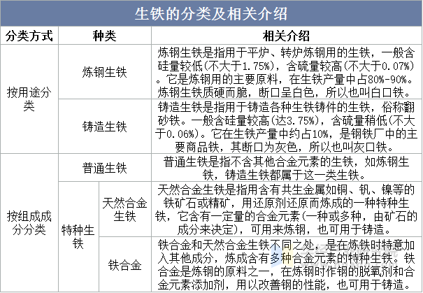 生铁按其用处可分为炼钢生铁和锻制生铁中;按其构成成分又可分为通俗生铁和特种生铁两种,此中特种生铁又可分为天然合金生铁和铁合金两类。